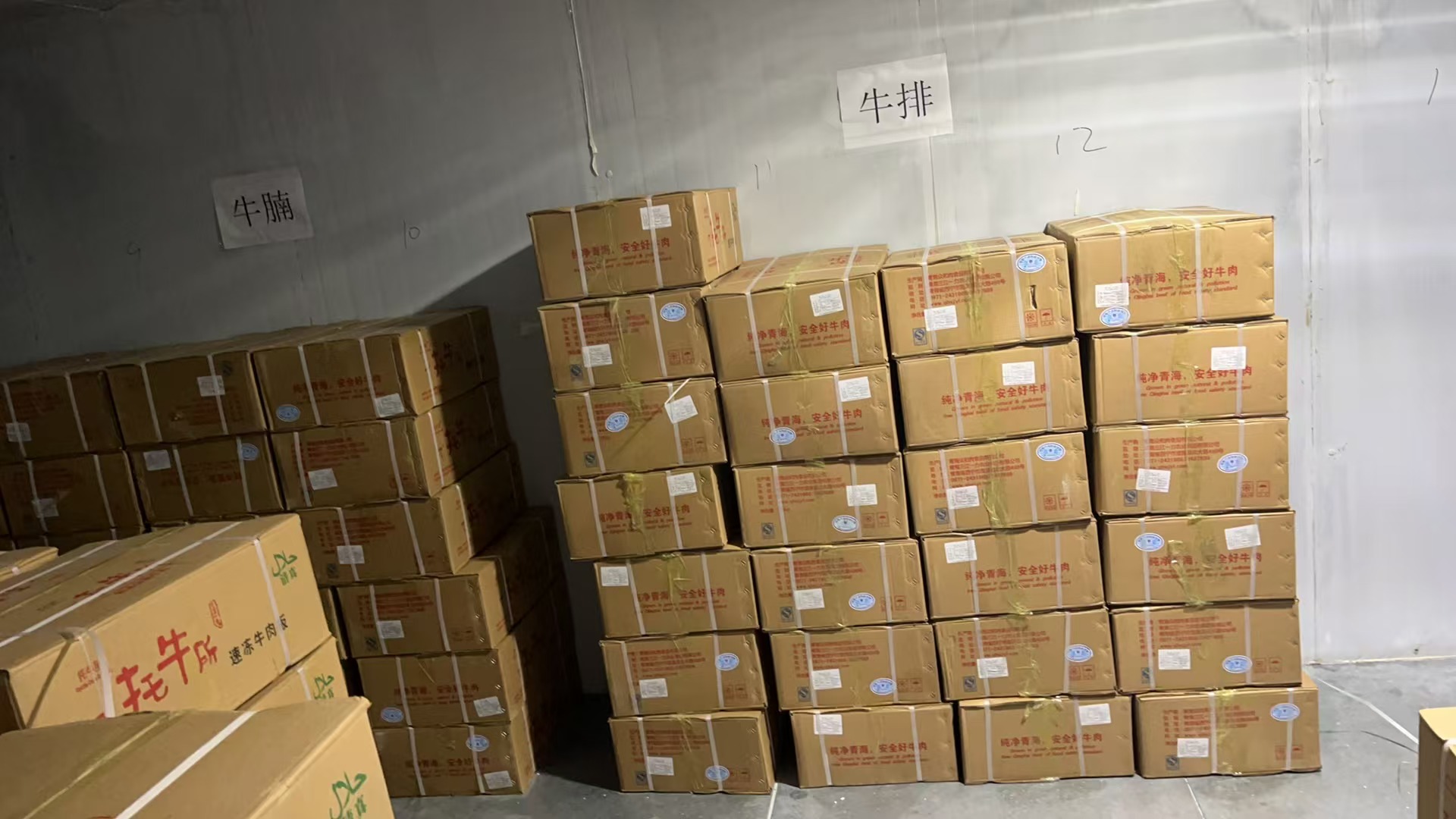 倉庫內擺放的牛排、牛腩等青海產品。