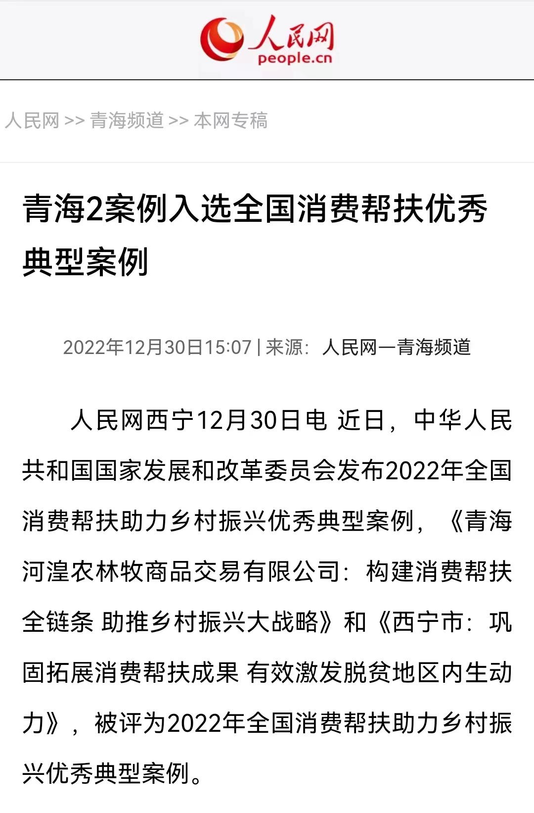 人民網(wǎng)西寧12月30日電 近日,中華人民共和國國家發(fā)展和改革委員會發(fā)布2022年全國消費幫扶助力鄉(xiāng)村振興優(yōu)秀典型案例,《青海河湟農(nóng)林牧商品交易有限公司(青海農(nóng)林牧商品交易中心):構(gòu)建消費幫扶全鏈條 助推鄉(xiāng)村振興大戰(zhàn)略》被評為2022年全國消費幫扶助力鄉(xiāng)村振興優(yōu)秀典型案例。